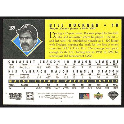 This is a 1994 Upper Deck All-Time Heroes Bill Buckner baseball card. The card is #189 and pictures show condition.