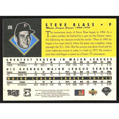 This is a 1994 Upper Deck All-Time Heroes Steve Blass baseball card. The card is #191 and pictures show condition.