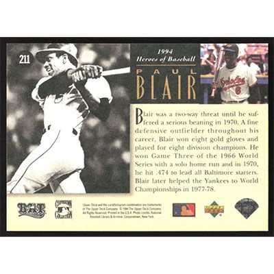 This is a 1994 Upper Deck All-Time Heroes Paul Blair Heroes of Baseball baseball card. The card is #211 and pictures show condition. Team(s): Baltimore Orioles