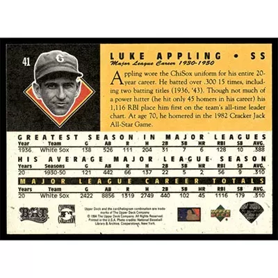 This is a 1994 Upper Deck All-Time Heroes Luke Appling baseball card. The card is #41 and pictures show condition.