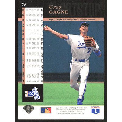 This is a 1994 Upper Deck Electric Diamond Greg Gagne baseball card. The card is #79 and pictures show condition.