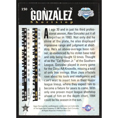 This is a 1994 Upper Deck Minors Alex Gonzalez Major League Evaluations baseball card. The card is #150 and pictures show condition. Team(s): Knoxville Smokies