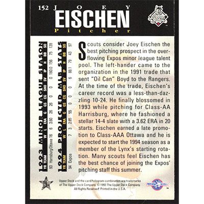 This is a 1994 Upper Deck Minors Joey Eischen Major League Evaluations baseball card. The card is #152 and pictures show condition.
