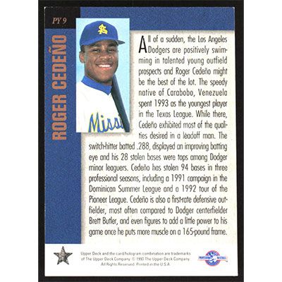 This is a 1994 Upper Deck Minors Player of the Year Roger Cedeno baseball card. The card is #PY9 and pictures show condition. Team(s): Los Angeles Dodgers