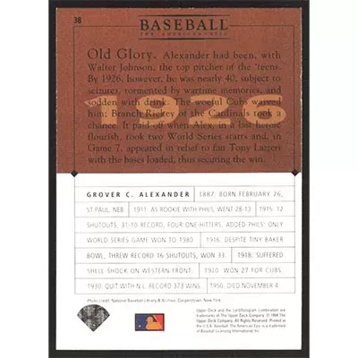 This is a 1994 Upper Deck: The American Epic Grover C. Alexander baseball card. The card is #38 and pictures show condition.