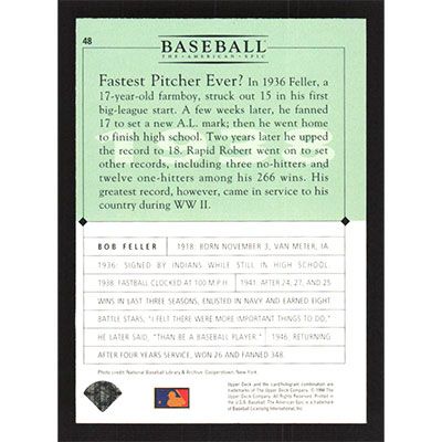 This is a 1994 Upper Deck: The American Epic Bob Feller baseball card. The card is #48 and pictures show condition.
