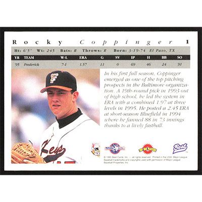 This is a 1995 Best Rocky Coppinger baseball card. The card is #1 and pictures show condition.