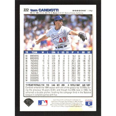 This is a 1995 Collector's Choice Tom Candiotti baseball card. The card is #222 and pictures show condition.