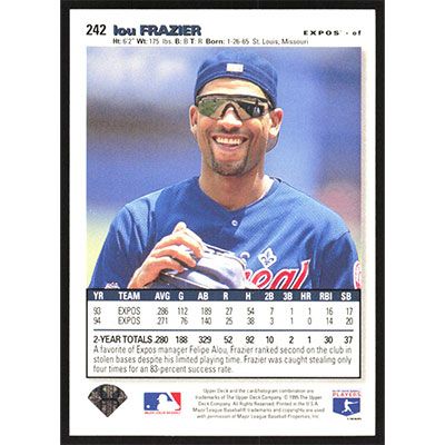 This is a 1995 Collector's Choice Lou Frazier baseball card. The card is #242 and pictures show condition.