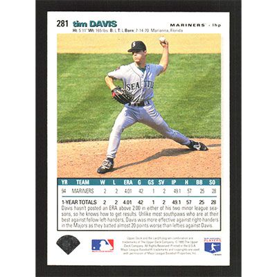 This is a 1995 Collector's Choice Tim Davis baseball card. The card is #281 and pictures show condition.