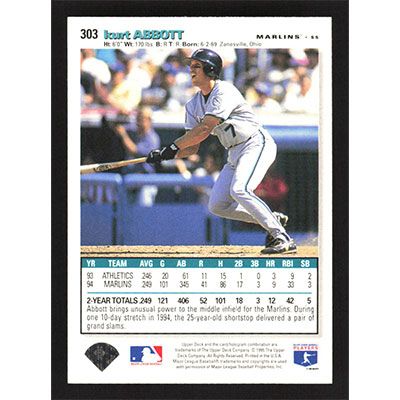 This is a 1995 Collector's Choice Kurt Abbott baseball card. The card is #303 and pictures show condition.