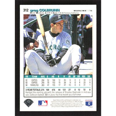 This is a 1995 Collector's Choice Greg Colbrunn baseball card. The card is #312 and pictures show condition.