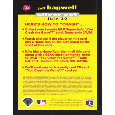 This is a 1995 Collector's Choice Crash the Game Silver Jeff Bagwell 7/30 baseball card. The card is #CG1 and pictures show condition. Team(s): Houston Astros