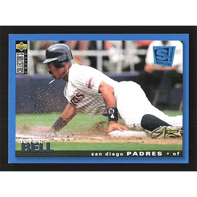 This is a 1995 Collector's Choice SE Derek Bell baseball card. The card is #165 and pictures show condition.