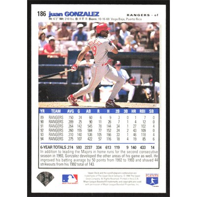 This is a 1995 Collector's Choice SE Juan Gonzalez baseball card. The card is #186 and pictures show condition.