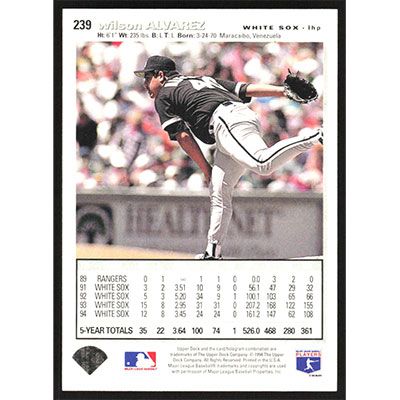 This is a 1995 Collector's Choice SE Wilson Alvarez baseball card. The card is #239 and pictures show condition.