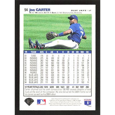 This is a 1995 Collector's Choice SE Joe Carter baseball card. The card is #54 and pictures show condition.
