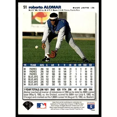 This is a 1995 Collector's Choice SE Silver Signature Roberto Alomar baseball card. The card is #51 and pictures show condition. Team(s): Toronto Blue Jays