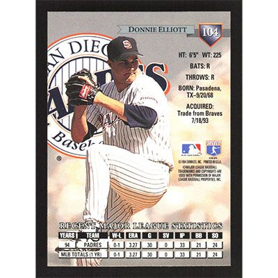 This is a 1995 Donruss Donnie Elliott baseball card. The card is #104 and pictures show condition.
