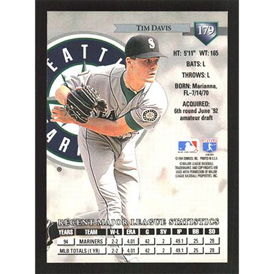 This is a 1995 Donruss Tim Davis Rated Rookie baseball card. The card is #179 and pictures show condition.