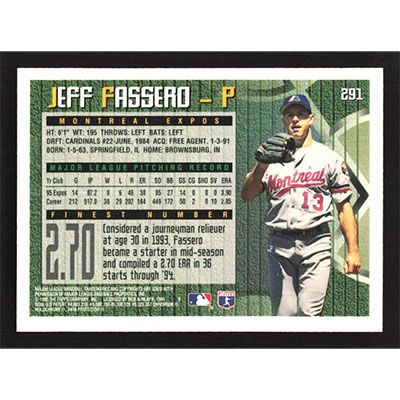 This is a 1995 Finest Jeff Fassero baseball card. The card is #291 and pictures show condition.