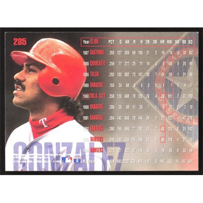 This is a 1995 Fleer Juan Gonzalez baseball card. The card is #285 and pictures show condition.