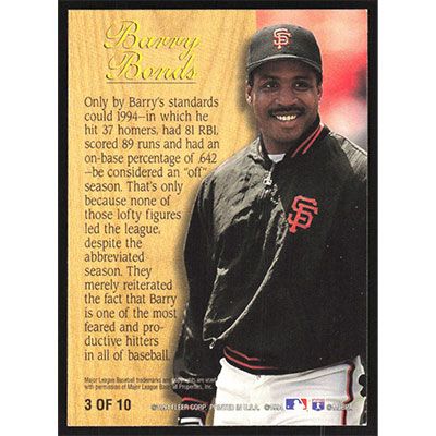 This is a 1995 Fleer Lumber Company Barry Bonds baseball card. The card is #3 and pictures show condition.