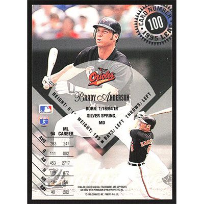 This is a 1995 Leaf Brady Anderson baseball card. The card is #100 and pictures show condition.