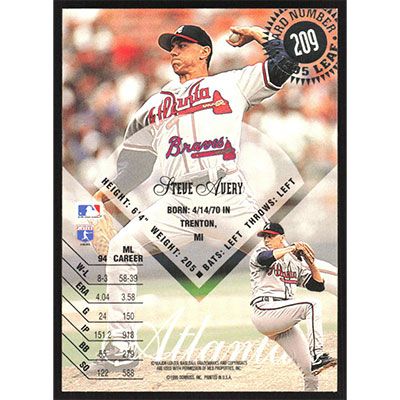 This is a 1995 Leaf Steve Avery baseball card. The card is #209 and pictures show condition.