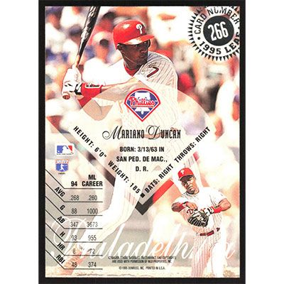 This is a 1995 Leaf Mariano Duncan baseball card. The card is #266 and pictures show condition.