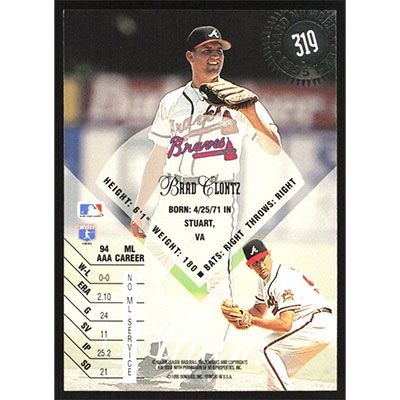 This is a 1995 Leaf Brad Clontz baseball card. The card is #319 and pictures show condition.