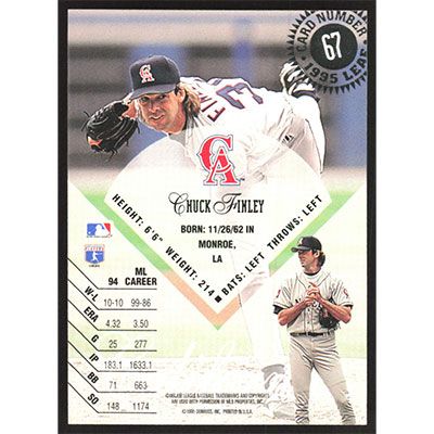 This is a 1995 Leaf Chuck Finley baseball card. The card is #67 and pictures show condition.