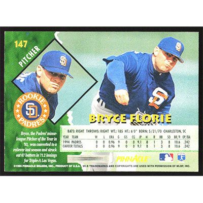 This is a 1995 Pinnacle Bryce Florie baseball card. The card is #147 and pictures show condition.