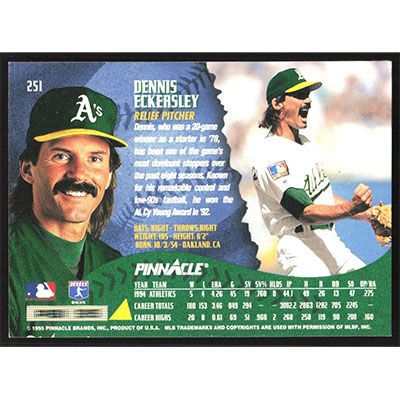 This is a 1995 Pinnacle Dennis Eckersley baseball card. The card is #251 and pictures show condition.