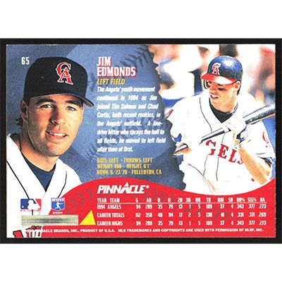 This is a 1995 Pinnacle Jim Edmonds baseball card. The card is #65 and pictures show condition.