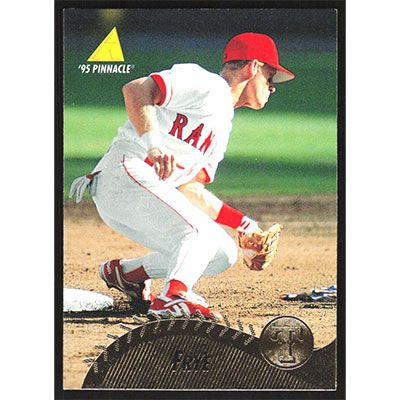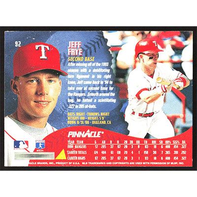 This is a 1995 Pinnacle Jeff Frye baseball card. The card is #92 and pictures show condition.