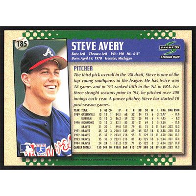 This is a 1995 Score Steve Avery baseball card. The card is #185 and pictures show condition.