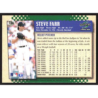 This is a 1995 Score Steve Farr baseball card. The card is #186 and pictures show condition.