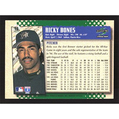 This is a 1995 Score Ricky Bones baseball card. The card is #98 and pictures show condition.