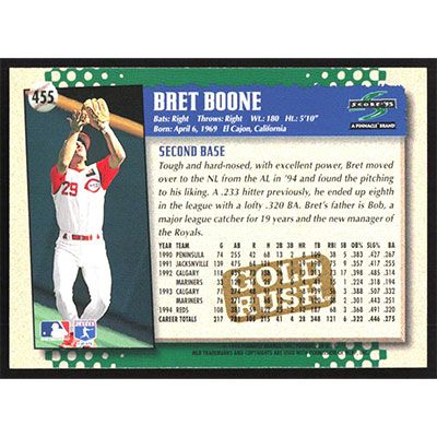 This is a 1995 Score Gold Rush Bret Boone baseball card. The card is #455 and pictures show condition.