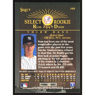 This is a 1995 Select Russ Davis baseball card. The card is #160 and pictures show condition.