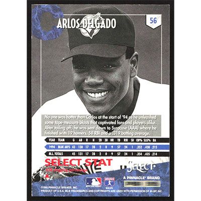 This is a 1995 Select Carlos Delgado baseball card. The card is #56 and pictures show condition.
