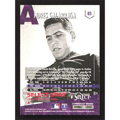 This is a 1995 Select Andres Galarraga baseball card. The card is #85 and pictures show condition.