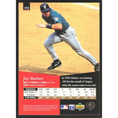 This is a 1995 SP Jay Buhner baseball card. The card is #192 and pictures show condition.