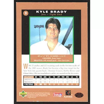 This is a 1995 SP Kyle Brady Premier Prospects football card. The card is #9 and pictures show condition.