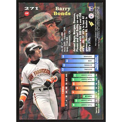 This is a 1995 Stadium Club Barry Bonds baseball card. The card is #271 and pictures show condition.