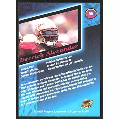 This is a 1995 Superior Pix Derrick Alexander football card. The card is #90 and pictures show condition.