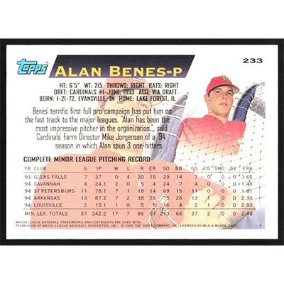 This is a 1995 Topps Alan Benes Future Star baseball card. The card is #233 and pictures show condition.