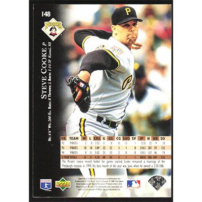 This is a 1995 Upper Deck Steve Cooke baseball card. The card is #148 and pictures show condition.