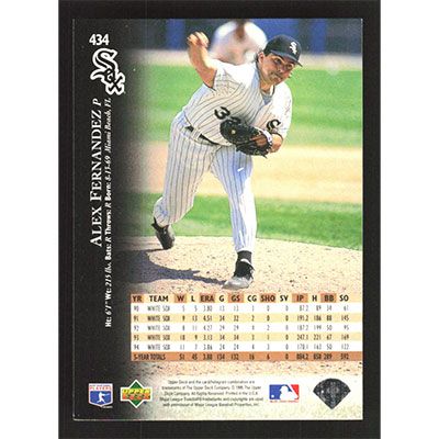 This is a 1995 Upper Deck Alex Fernandez baseball card. The card is #434 and pictures show condition.